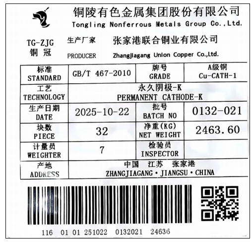 [INE] Announcement on the Approval of Registration of Grade A Copper Cathode Brand “TG-ZJG Tongguan” of Zhangjiagang Union Copper co.,Ltd.
